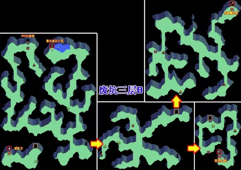 打倒BOSS后,进入废坑矿三层的地下矿区,这里地形错综复杂,不过藏着不少宝物。你能找到[セルセタのはな塞尔西达之花]、[てつこうせき铁矿石]、[じやぁくな すず邪恶之铃]和[ライトのまほう光源魔法杖]这些物品。