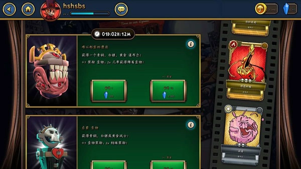 圣物:玩家进入圣物页面后,能在此处购买不同等级的圣物宝箱。圣物宝箱共有五类,不过其中仅两种可直接购买,其余宝箱需玩家收集碎片或等待开启时间才能获取。