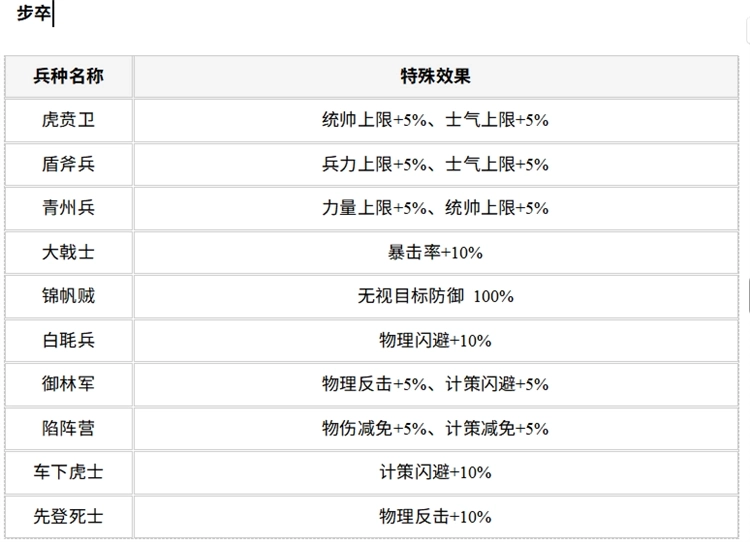 1、武将兵种-步卒:作为基础近战兵种,步卒具备较高的生命值与防御能力,是战场前排的核心力量,擅长承受伤害并向前推进,为后排部队提供保护,能够适配各类常规作战阵容,是新手前期的重要兵种选择。