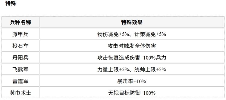 4、武将兵种-特殊:这是游戏里的稀有兵种,具备专属技能和独特战斗特点,既拥有功能性又具备战斗力,适合各种个性化战术体系,解锁后可显著增加阵容的多样性并提高作战上限。