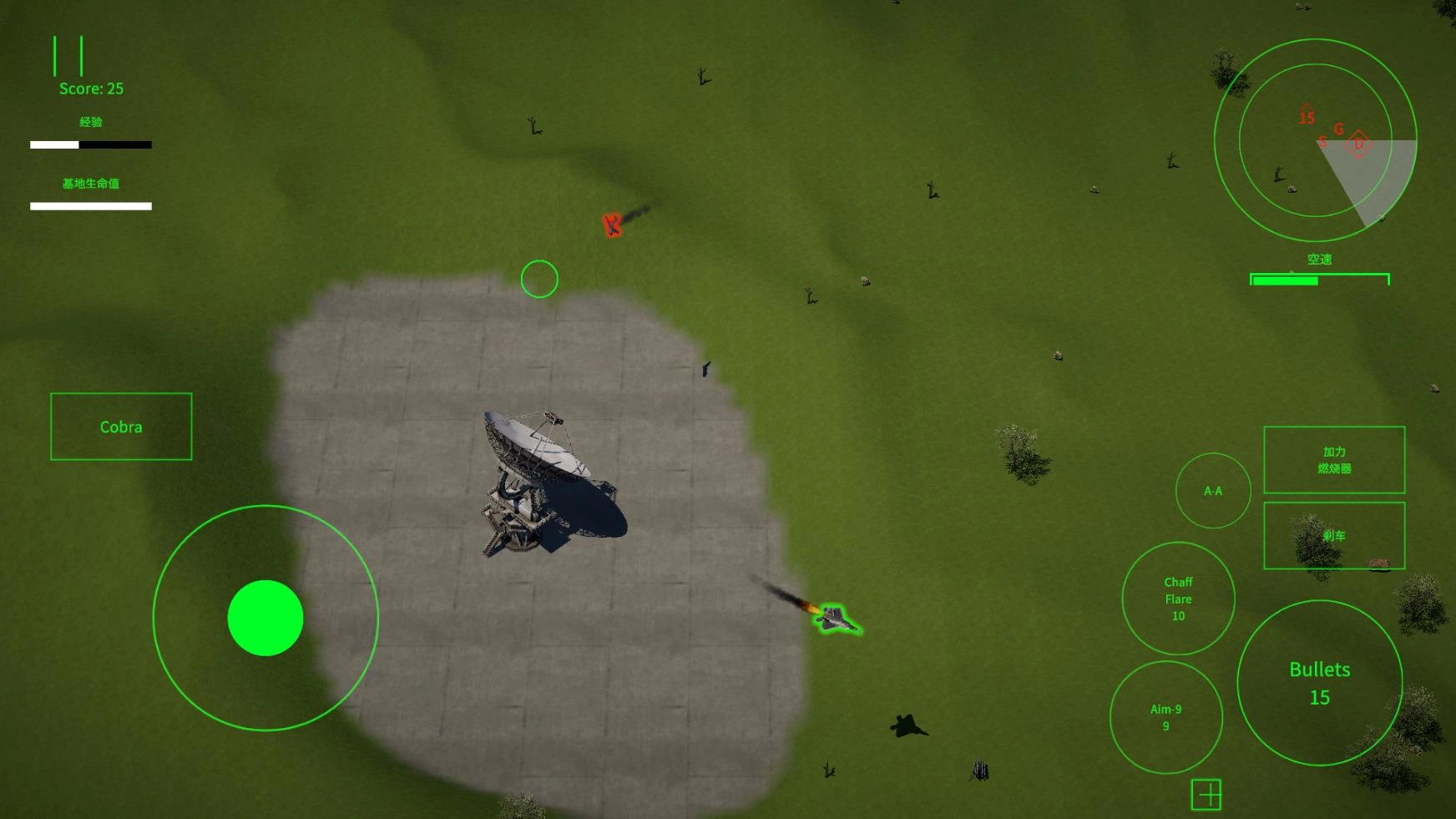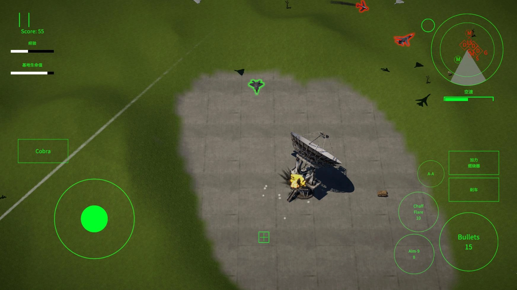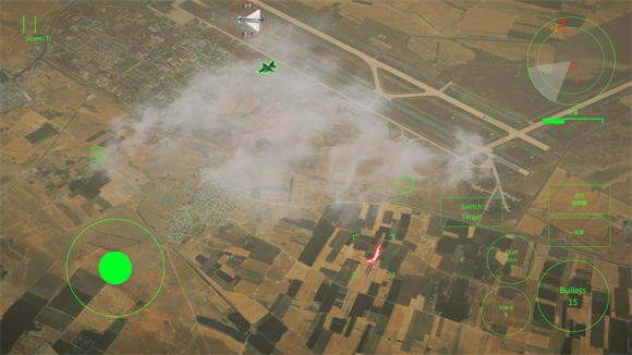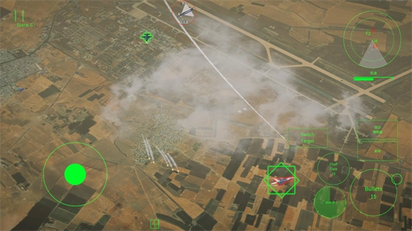 正式启动后,左侧负责操控战机的飞行,右侧则排列着机枪、导弹、热诱弹、加速以及刹车按钮。