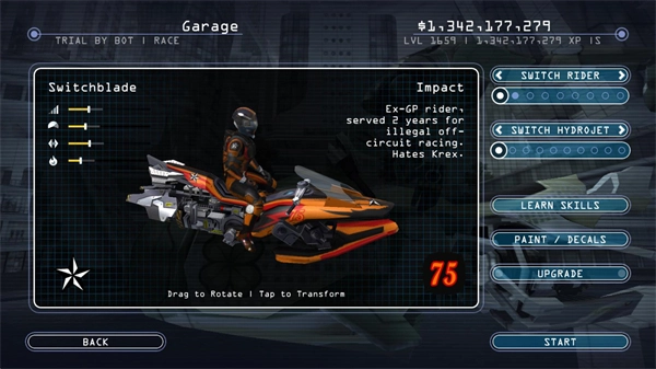 选好地图后,你可以挑选自己的快艇,还能对快艇进行升级;等所有选项都确定好,点击start就能开启比赛了。