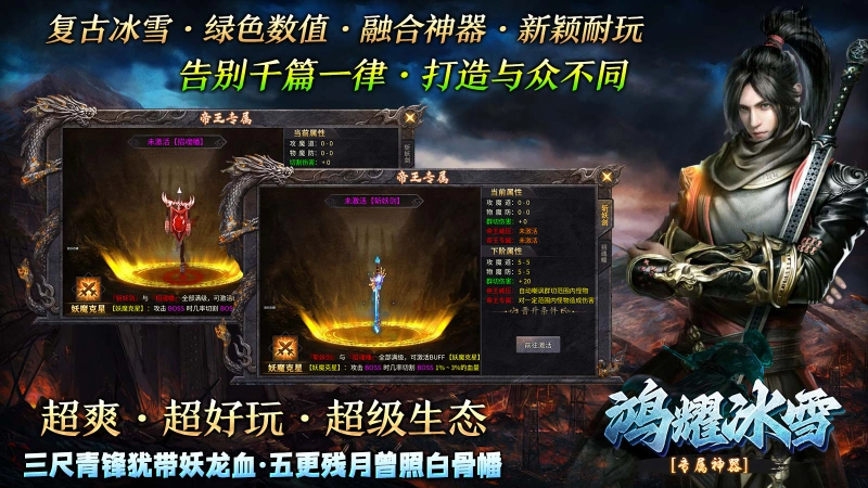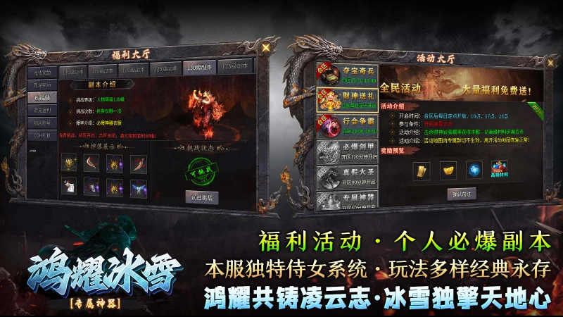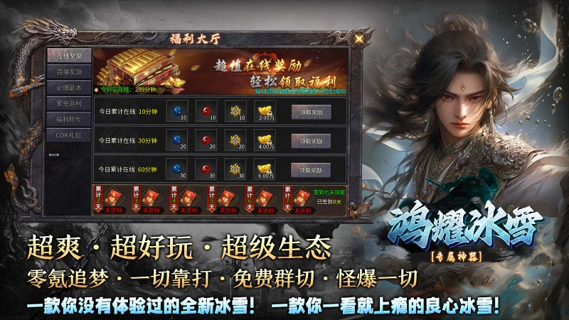 鸿耀冰雪,180单职业冰雪神器版本,带来独创新颖的侍女玩法,让你体验全新游戏模式,畅享无限热血激情!本服上线即赠光速拾取、自动回收、专属群切、爵位侍女等丰厚惊喜福利,助力你轻松开荒打怪,发育过程毫无压力!本服二大陆才是激情的起点,这里能爆出游戏内所有顶级装备与道具,BOSS还会掉落真充灵符,不氪金也能玩得尽兴,零氪玩家可顺利通关,人人都能追逐游戏梦想!