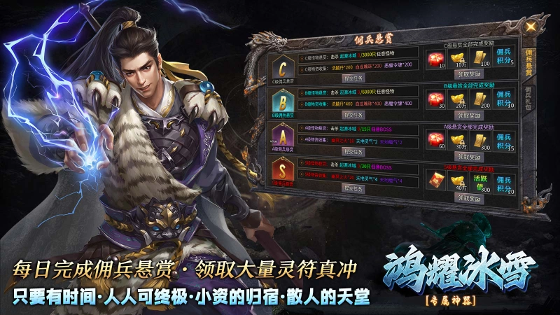 每天务必完成佣兵悬赏任务,能免费得到许多元宝、灵符和充值奖励,不氪金也能轻松游玩。