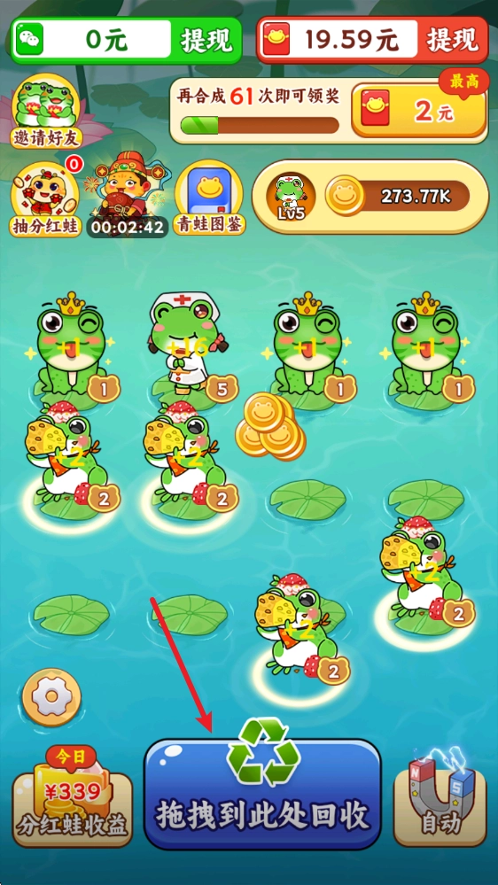 这是一款简单又有趣的合成小游戏,操作十分容易上手,你只需要持续召唤各种各样的小青蛙,再将它们进行合成,就能收集到造型各异的可爱青蛙,解锁丰富的奖励!而且合成出来的青蛙等级越高,你所能获取的福利也就越丰厚。