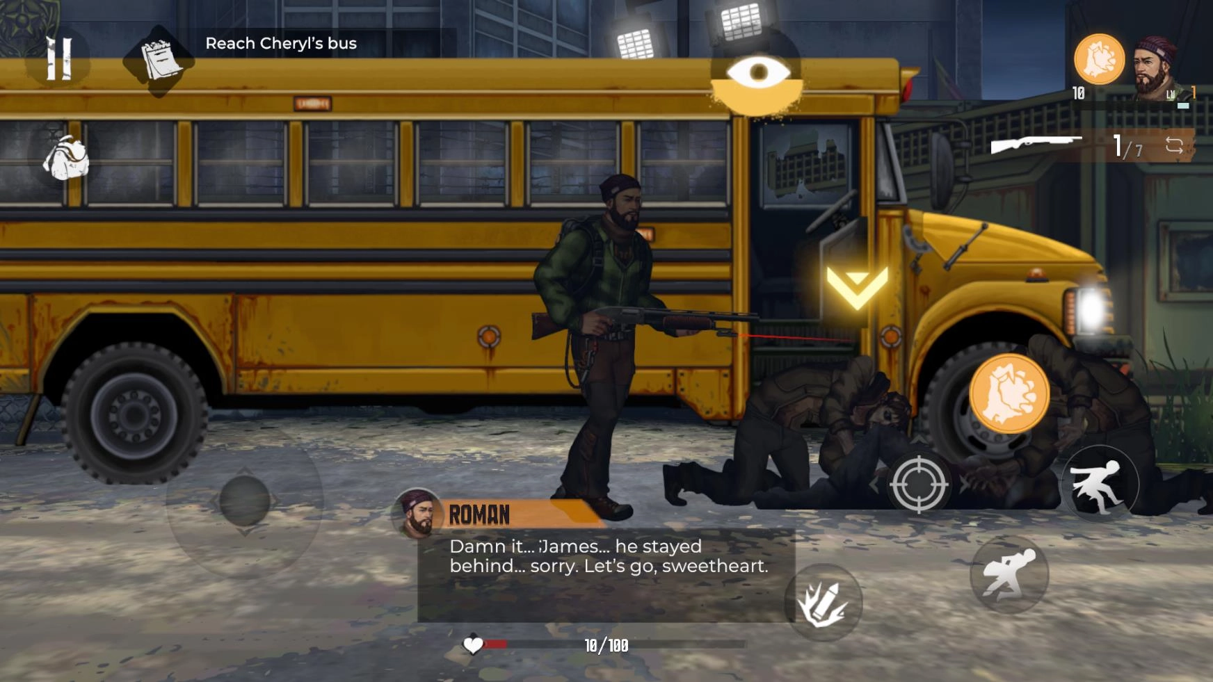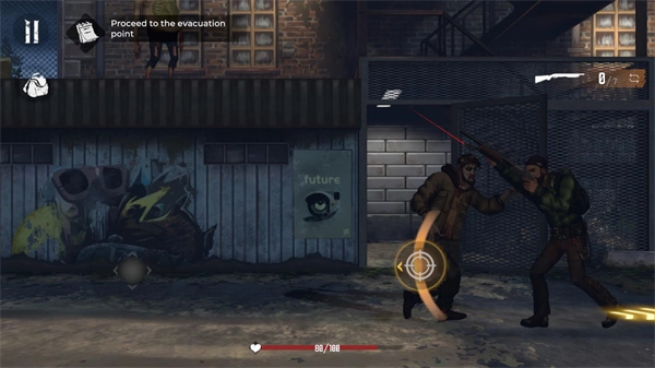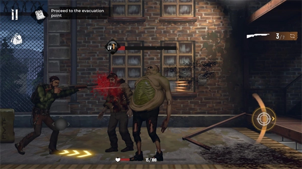 当遭遇僵尸怪物时,可点击射击按钮发起攻击,而使用黄色按钮则能投出手榴弹对敌人展开攻击。