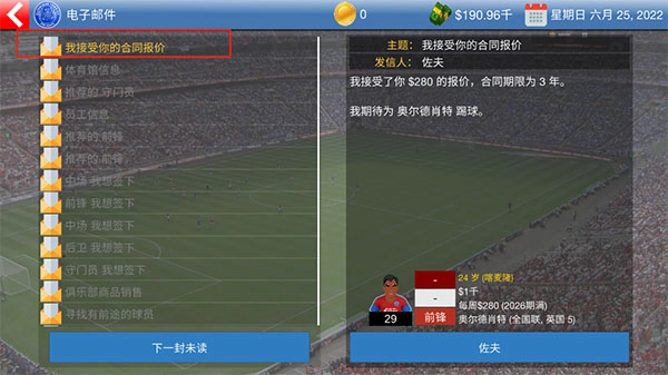 最后在收件箱中查看,若球员接受报价即表示购买成功。