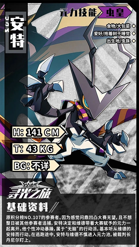 安特曾是凹凸大赛积分榜排名第107位的参赛者。由于觉得自己没有希望在大赛中夺冠,同时也不愿每天都被其他参赛者追击,他便和维德商议,打算带着大赛授予的元力一同离开赛场。