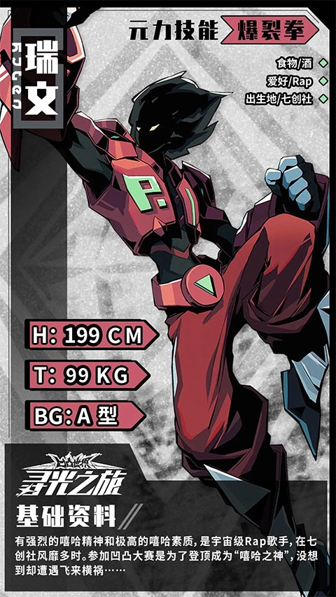 瑞文拥有着浓烈的嘻哈精神与顶尖的嘻哈素养,是一位宇宙级别的说唱歌手,在七创社早已风靡许久。他参加凹凸大赛的目标是登顶并成为“嘻哈之神”,可谁也没料到,途中竟遭遇了意外横祸。