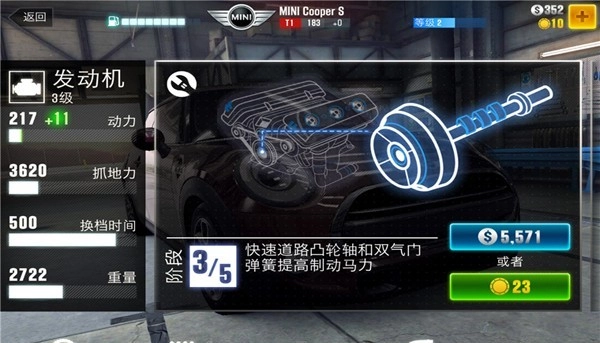 游戏初期是新手引导环节,此时想赢得比赛十分容易,但到了后期就必须不断调整车辆参数才能持续取胜。进入赛车的升级页面后,用手指滑动下方的部件栏,就能清楚看到每个部件对应的阶段以及各项属性的等级情况。