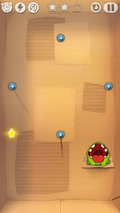 在游戏里,玩家需要剪断绳子,让糖果既能撞破周围的星星,又能顺利落入Om Nom的口中。