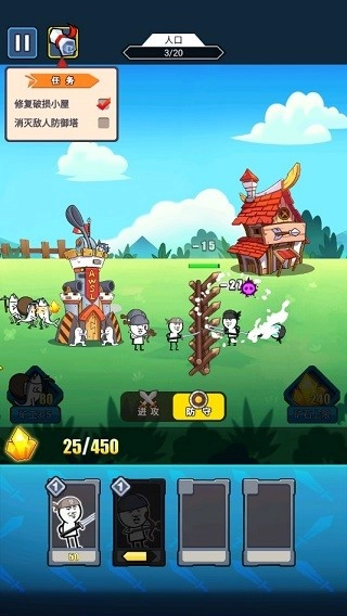 在这款游戏里,玩家得操控矿工进行挖矿作业,把挖到的矿物用来招募士兵,再借助这些士兵开展防守或进攻行动,只有成功摧毁敌方的防御塔才算赢得胜利,要是己方的防御塔被摧毁就会遭遇失败。