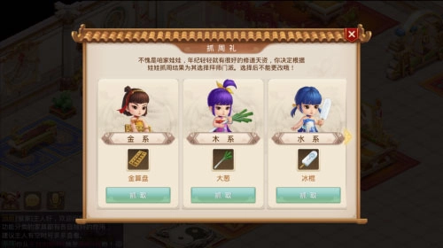 当婴幼儿的成长度达到1000时,就能举办“抓周”仪式,从五系师门里挑选一个进行拜师。到了这一步,距离娃娃的养成已经很近了!抓周结束后,娃娃就会顺利进入儿童期,建议道友依据娃娃的性格和自身的加点情况,为其选择合适的门派。