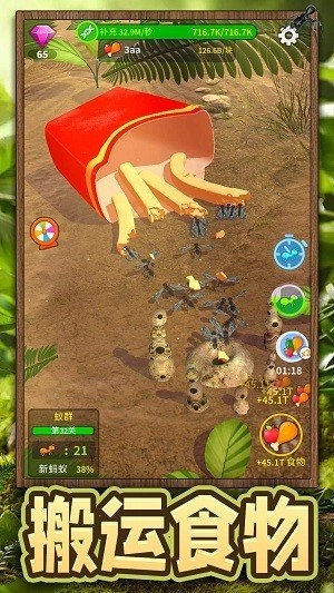 这是一款以蚂蚁族群为主题的模拟休闲游戏,玩家将带领自己的蚁群开启一场充满未知的野外生存冒险。在这个过程中,你需要不断壮大蚁群规模,提升部落的整体实力。当遭遇各类天敌威胁时,要巧妙运用策略守护领地,通过紧张刺激的生物对决获取更多资源,确保每一只蚂蚁都能在安全的环境中健康成长。此外,游戏还设有多个风格迥异的地图区域,等待玩家去探索和发现隐藏其中的奥秘。