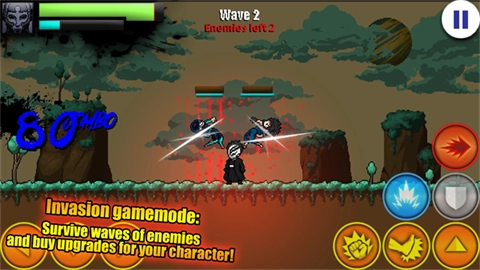 1、战斗开始后,左侧方向键用于操控移动,右侧上方的按键负责跳跃动作。
