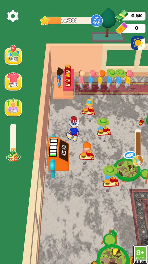 1、进入餐厅后,先把垃圾拖到垃圾桶里,接着滑动屏幕擦地、点击餐桌进行整理,完成这些清洁任务就能赚取金币,之后可以用金币解锁新的区域、升级餐厅的设施。
