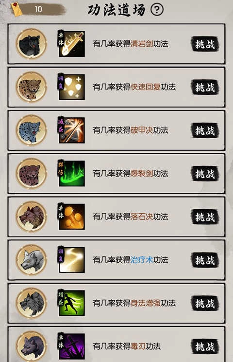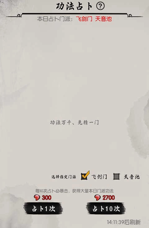 8、功法占仆每日会随机出现两个门派,大家可以先存着玉,等自己门派出现时再抽取,另外要记住十连抽有保底机制,尽量不要单抽。