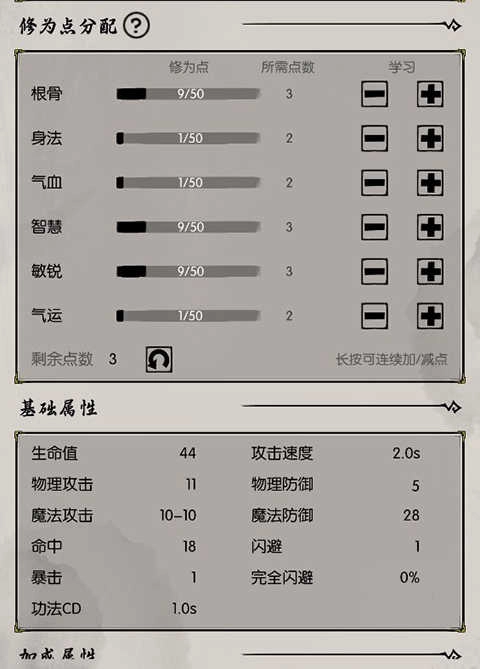 1、开局时建议这样分配技能点:属性点优先加根骨,之后结合前置功法的要求去推进游戏流程;通过打坐的方式,就能加入自己喜欢的门派了。