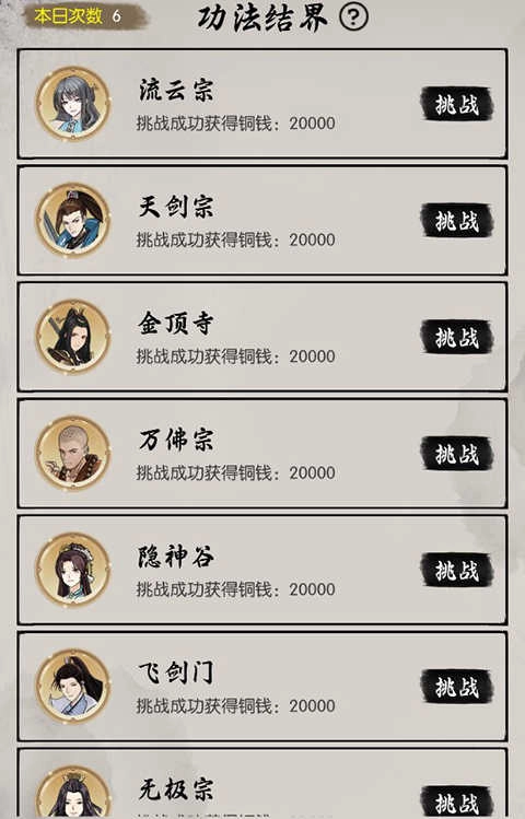 4、分散攻打功法结界的收益是最高的,不要把六次机会都用在同一个结界上,每天凌晨12点会进行结算。