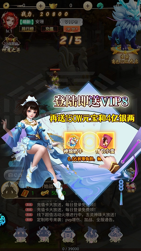 每日登录福利多多,千元充值卡、热门神将太清、活泼可爱的伙伴阿奴奴、传说级神器乾坤扇接连上线,只要登录就能领取。