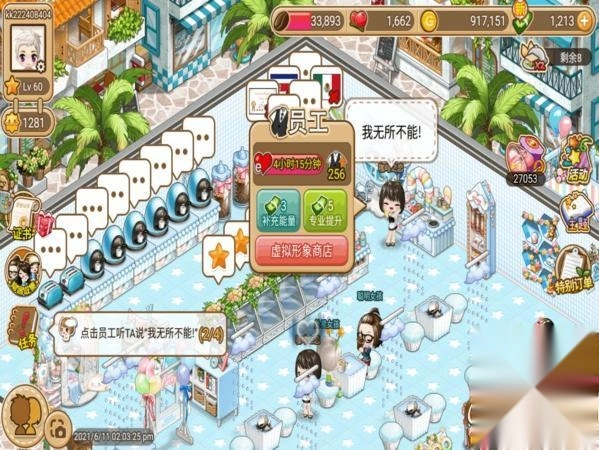 店员每日的爱心服务时长固定为4小时,一旦超出这个时长,员工容易出现倦怠状态,咖啡与配菜的制作效率也会显著下降。为维持员工的工作积极性,需及时对店员进行拖拽操作,每次拖拽可延长30分钟的工作时间。