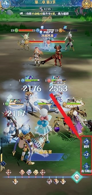 3、在战斗界面,可点击右侧查看角色羁绊,也能点击下方的x2按钮加速战斗进程;若对战斗结果信心满满,还可以直接选择跳过战斗环节。