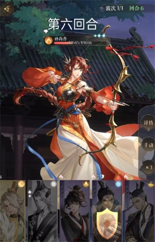 4、到了第六回合,依旧让颜良释放大招来吸收敌方的大招伤害,其余队员则依据实际战况灵活使用技能,之后就主要以普通攻击为主,并且要把队伍里输出能力最强的单位留到最后阶段。