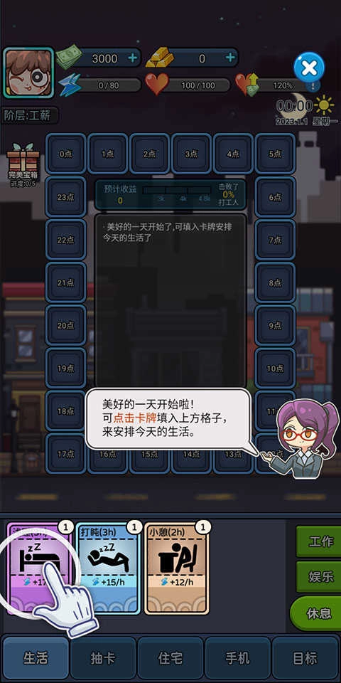 1、清晨已至,崭新的一天拉开序幕!点击卡牌并将其放入上方的格子里,规划好今日的生活安排。