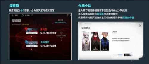 (1)探索阶段包含多个区域,划分为重灾区与低浓度区。作战小队进入对应章节时,需依据章节类型挑选小队成员;进入探索后,仅能在安全区节点调整阵容,且探索期间成员仅可在安全区或触发特殊事件时恢复生命值。