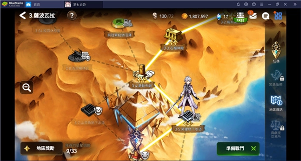 在《第七史诗》中,每个地区对应着游戏故事的一个章节,所以探索地区的过程也是了解对应章节主线故事的过程。进入地区地图界面后,点击右侧栏的「任务」图标,就能查看当前章节的任务内容。每个章节包含多个任务,点击任务标签右侧的「前往」图标,就能直接跳转至该任务的执行环节。完成每项任务都能领取相应奖励,而当章节内所有任务都完成后,还能额外领取章节专属奖励。