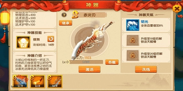 火焰山中的一把玄刀,灼热的刀身甚至可以把空气扭曲,甚至连极寒之地的玄冰也无法降低刀身温度,拥有增加血量的天赋,对战中挥舞鬼火赤炎,立斩敌人于修罗之下。