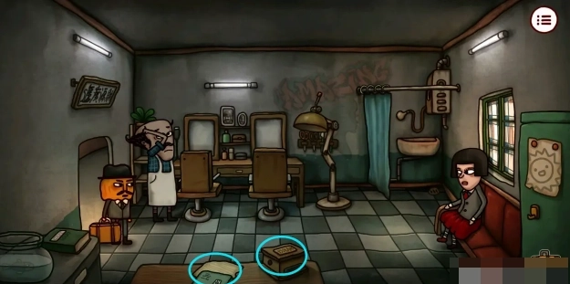 3、走楼梯到理发店门口,拿走门口袋子里「头发」后进入理发店。与店长对话获得任务,将明信片交给店长后获得「金剪刀」。接着拿走女顾客后面沙发上的「打火机」,再观察桌子上的说明纸条。