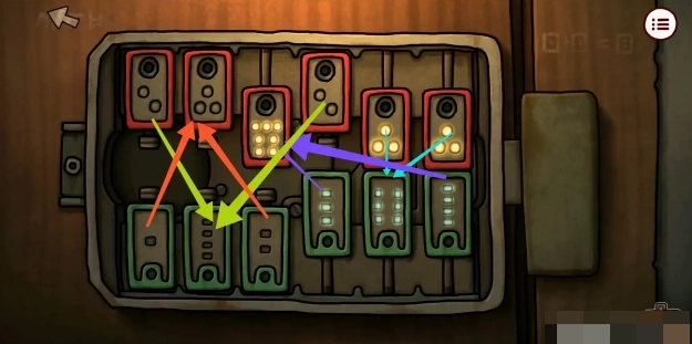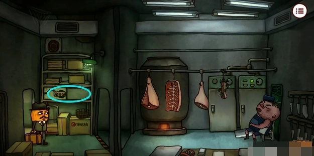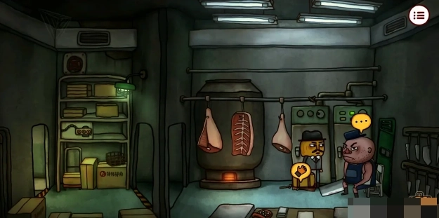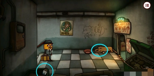 4、回到初始房间走右边楼梯来到屠宰场门口,拿走左下角的「油漆刷」后进入屠宰场。点击架子上的机关,根据之前拿明信片的箱子上的提示完成机关,打开右边的柜子后拿到里面的「绝缘手套」,接着点击20次猪肉达成成就【太想吃肉了】。