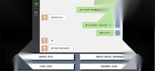 聊天前,要查看她的朋友圈(注意在约会看电影前如果不看朋友圈,就不会有喵尔么斯这个选项,进而无法达成完美结局)