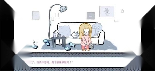 加班到很晚回家遇到满地垃圾,当然是要你自己收拾了,不要点选项!点击地面上的垃圾,她也是非常懂事会自己收拾,然后让你去休息。