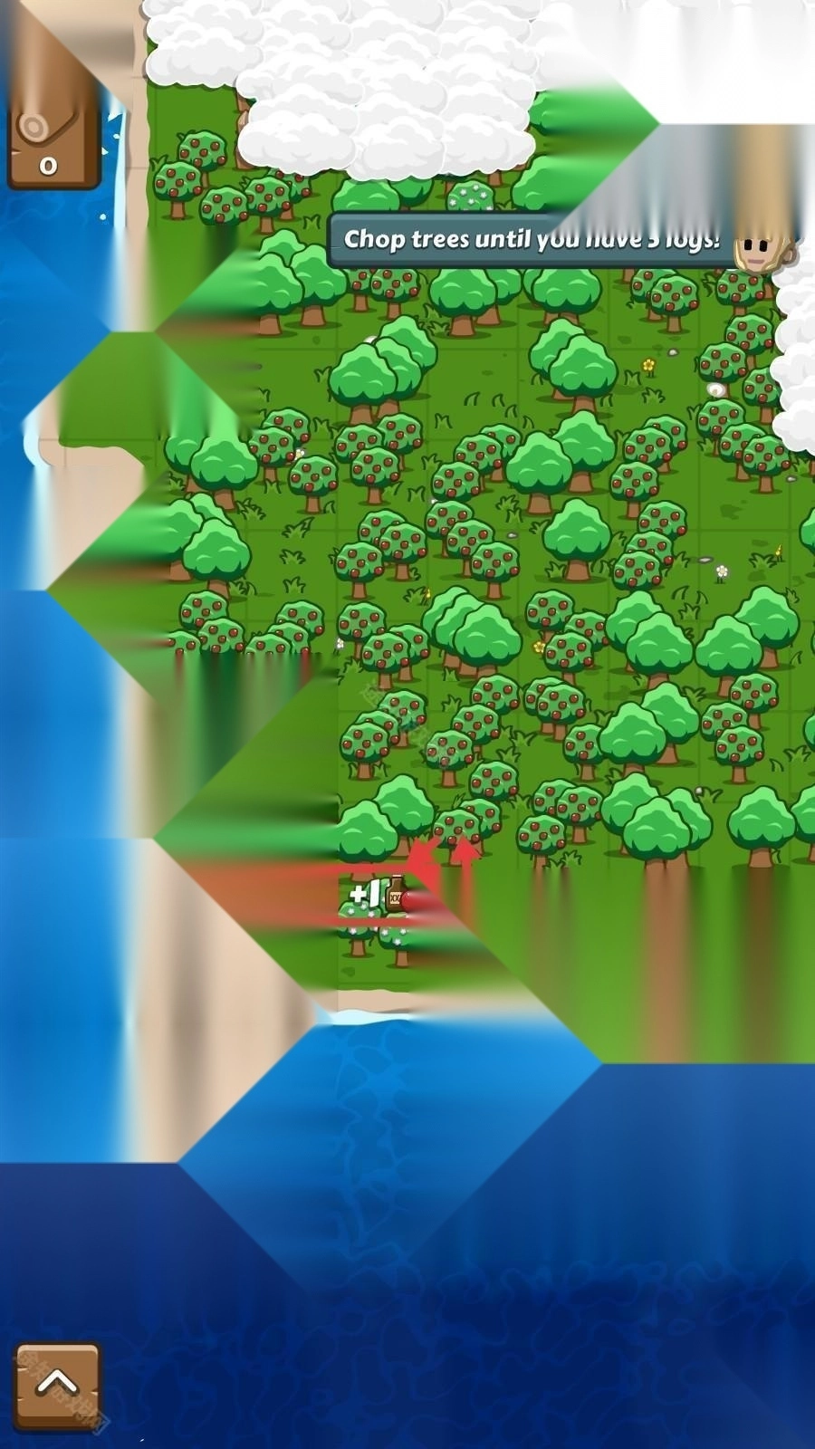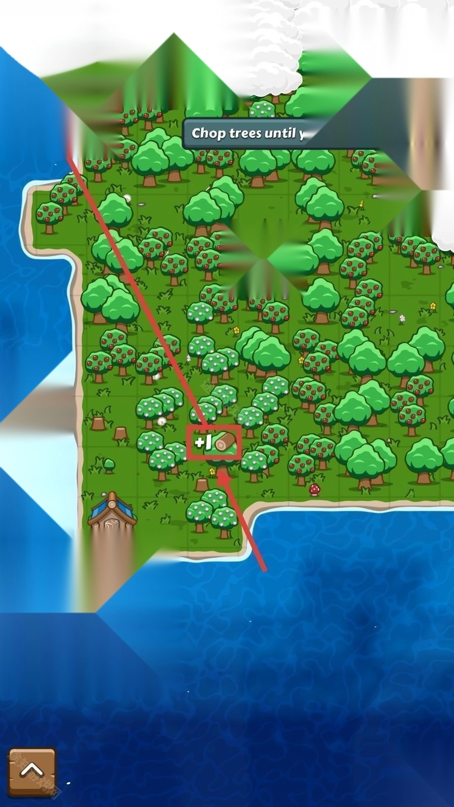1、根据提示【Choptreesuntilyouhave5logs!】,点击岛屿上的树木,每次砍伐可获得【+1】资源,开始收集木材。