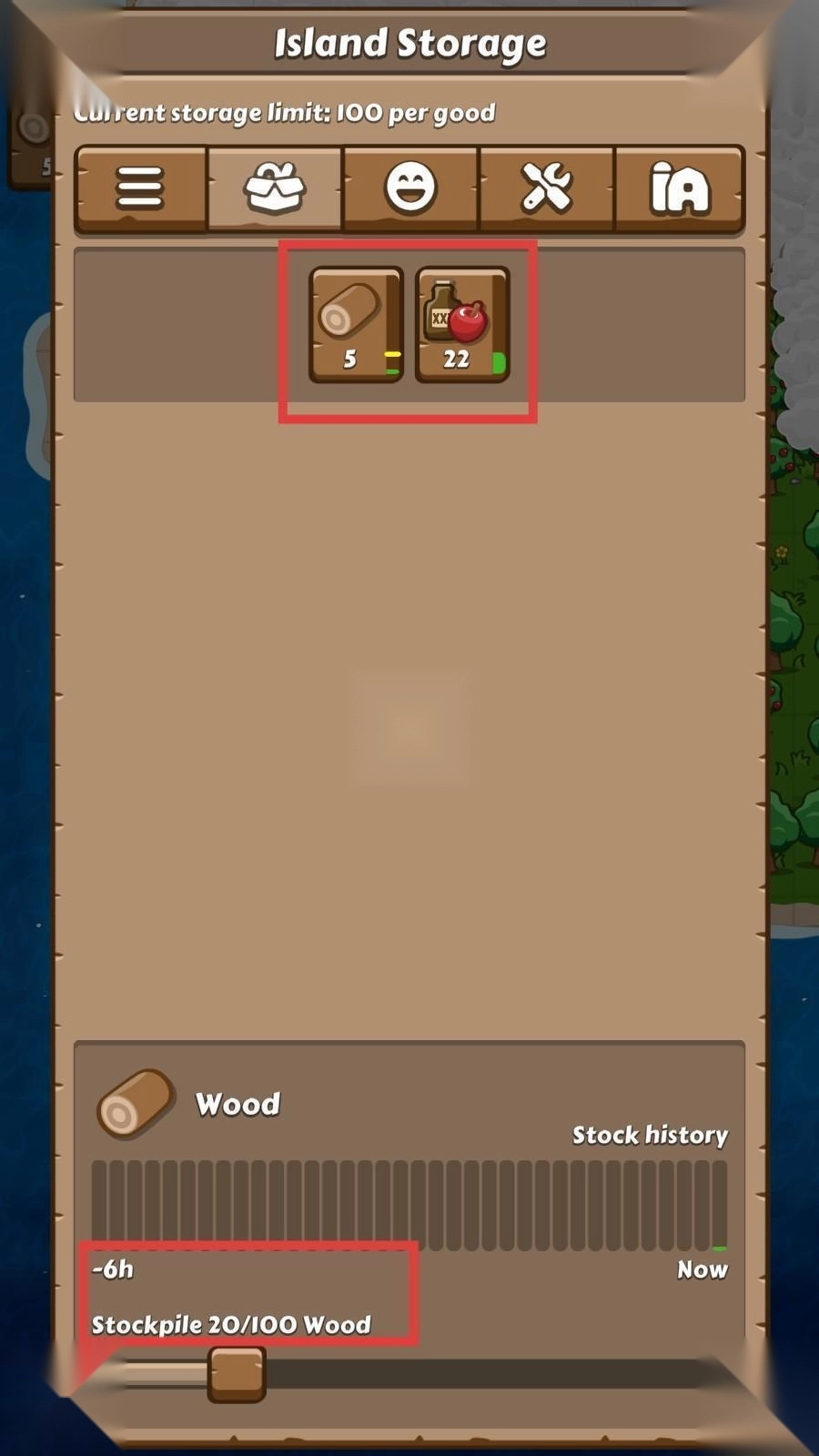 3、进入【IslandStorage】界面,可查看木材(5)、苹果酒等资源的存储情况,同时关注木材的存储进度【Stockpile20/100Wood】。