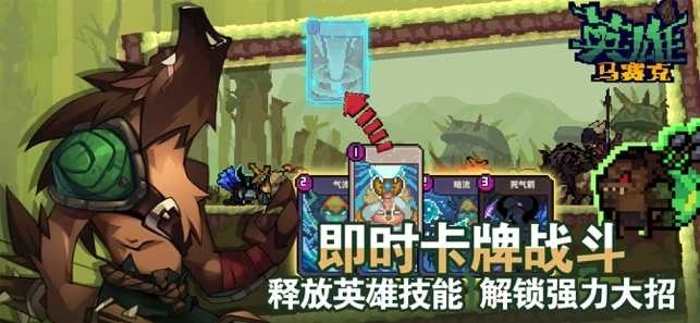 3.这款游戏采用复古像素风格的画面,英雄与怪物的形象则是简洁的卡通设计,并且游戏里的每个英雄都配有独特的技能卡牌。