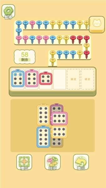 1、借助四消螺丝的玩法来完成关卡挑战。需把螺丝放置到与其颜色对应的螺丝盒中。