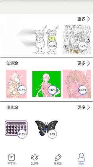 1、创意涂:可以选择任意颜色,会根据选择的颜色智能填充图片区域。大量二次元图片,等你来玩。