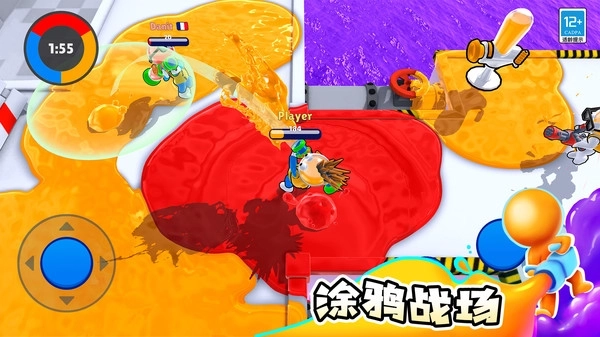 2、灵活借助地形来规避对手的攻击与阻拦,玩家还能潜入己方队伍的油漆区域,以此提升移动速度、恢复战斗能力,全新的涂鸦大战已然开启,自由的对抗,解锁全新的冒险。