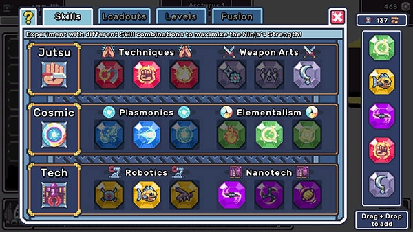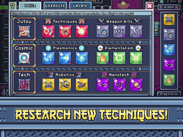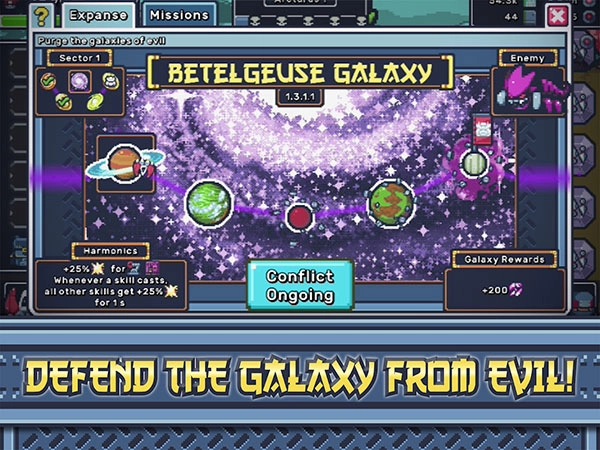 空间忍者大师是一款以忍者为背景、趣味满满的空间RPG放置游戏。在游戏里,你将穿梭于银河系,锤炼自身的忍者技艺,用忍术对抗猎枪,击退可怕的太空怪物,在这片星际宇宙中为帝国复仇。游戏拥有独特的美术风格,卡通像素风的角色形象搭配宏大的背景世界观,能让玩家体验到别具一格的RPG玩法;其剧情设定新颖,玩家可通过选择不同能力来提升自己,战胜敌人获取资源,武装自身以完成为帝国复仇的使命。