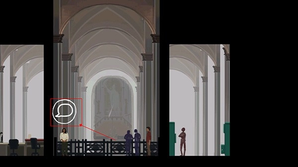 4、走到对话对象面前,点击开始对话,结束后向左走,还会触发一次对话,之后走到左侧最底部。