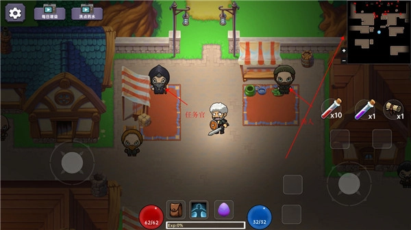 4、进入游戏后,在右边的商人那可以购买一些道具,在左边的任务官处领取任务,观看右上角的小地图来战斗。