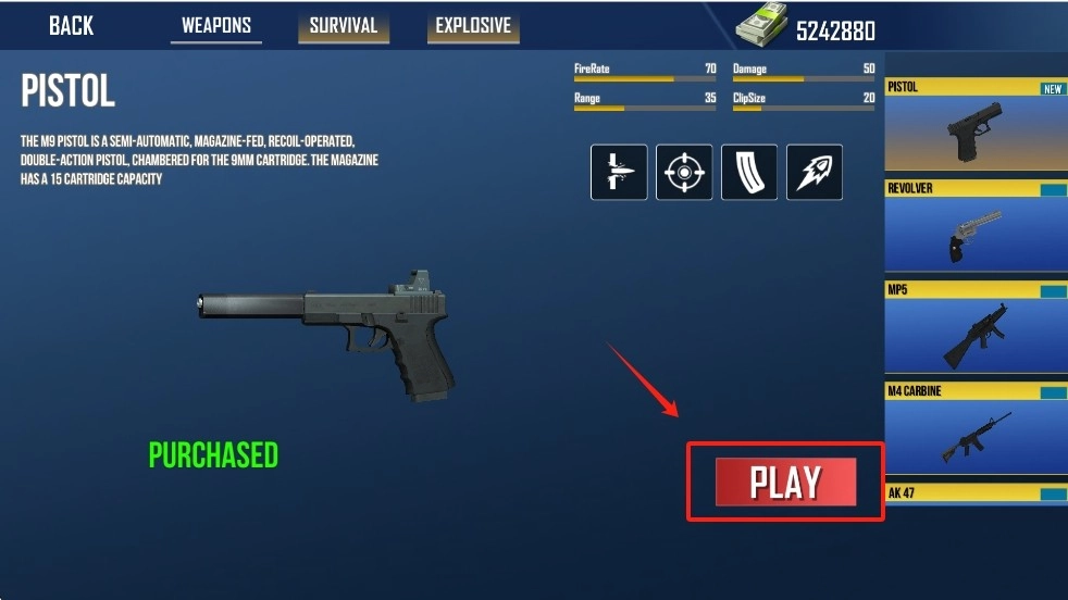 1、进入游戏商店界面,选择武器,点击“PLAY”键开始游戏。