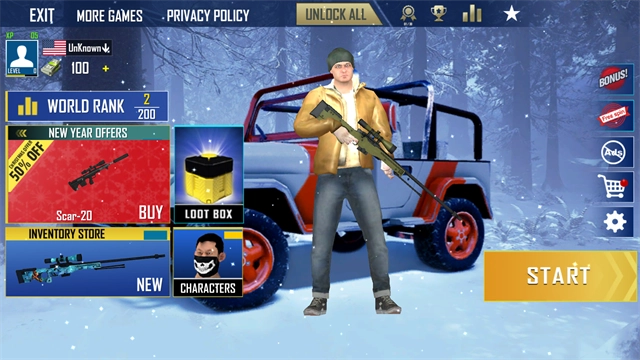 冬季生存大逃杀是一款极具刺激性的在线射击大逃杀游戏。它沿用了经典的大逃杀玩法,将场景设定在白雪覆盖的山林里,这让玩家更易暴露行踪,从而提升了游戏的挑战性。在游戏中,玩家能够在地图的各个角落搜集枪械和物资来武装自己,还能驾驶车辆四处寻找落单的对手。玩家既可以正面用武器攻击敌人,也可以凭借策略绕到敌人身后发动致命袭击。