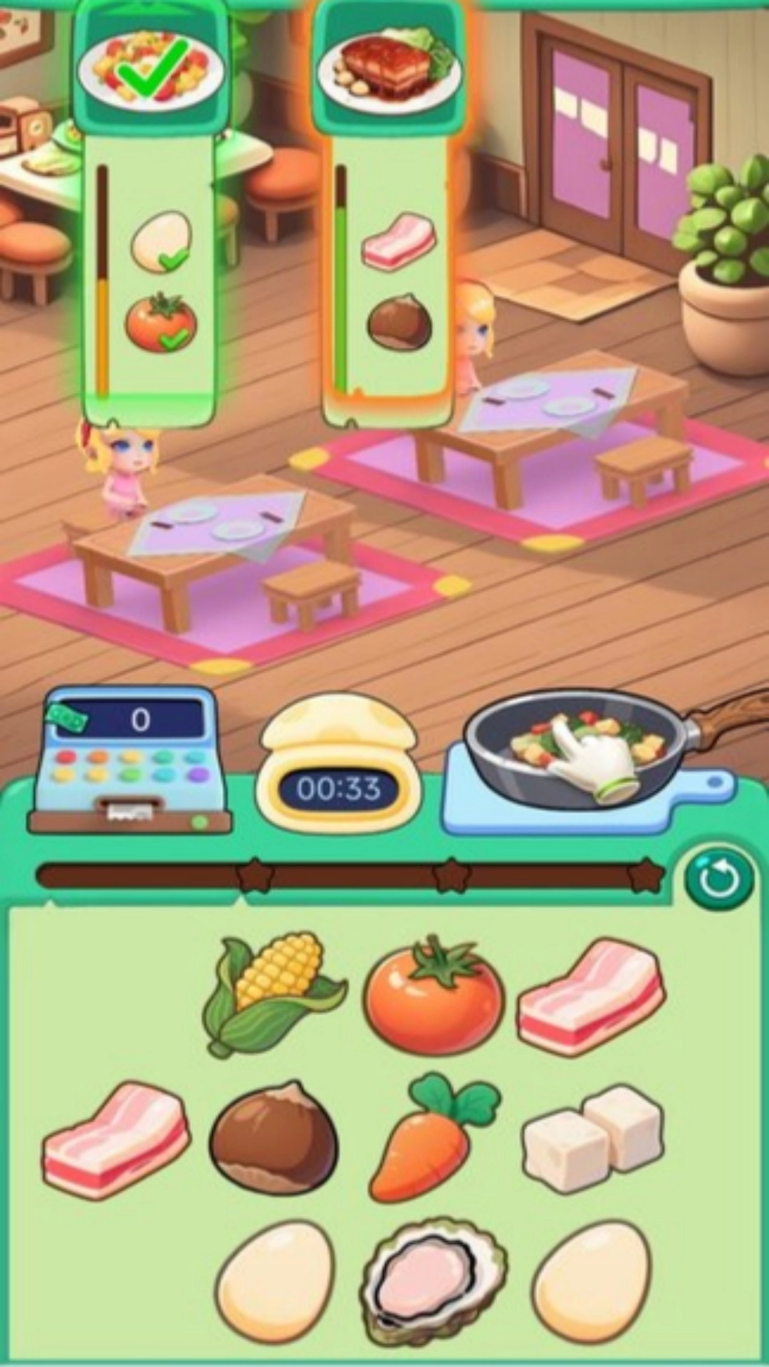 2、经营环节需依托消消乐玩法获得的资源,合理规划美食制作、售卖等策略,提升店铺运营效率与收益。