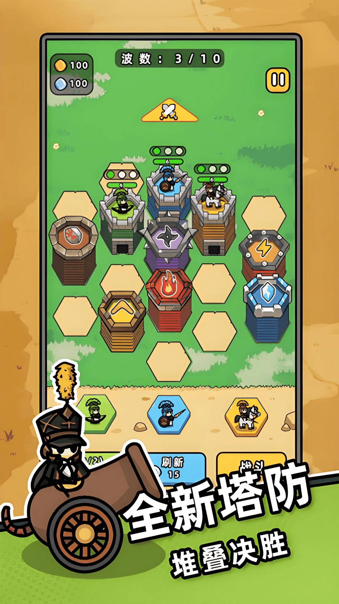 2、可以通过刷新商店获取更多类型的士兵,以此组建适配的防守阵容,在防守阶段击败所有敌人。