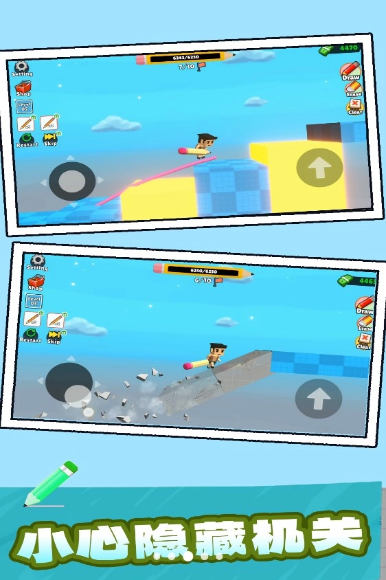 《划线火柴人》是一款极具创意的游戏,玩家需通过画线引导角色展开跑酷冒险。你可以自由绘制各类线条与图案,为角色铺就通往终点的路径,同时巧妙避开障碍物与陷阱。游戏内设有多样化的关卡设计与挑战,玩家需灵活应对,探寻最佳跑酷路线,借由富有创意的画线方式展现跑酷技能,尽情享受涂鸦风格的视觉盛宴,挑战高分,畅快奔跑。