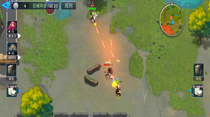 3、配备复活与补给机制,玩家可借助复活道具重返战场,而医用绷带这类补给物品能够及时恢复角色状态,从而减轻生存挑战的难度。